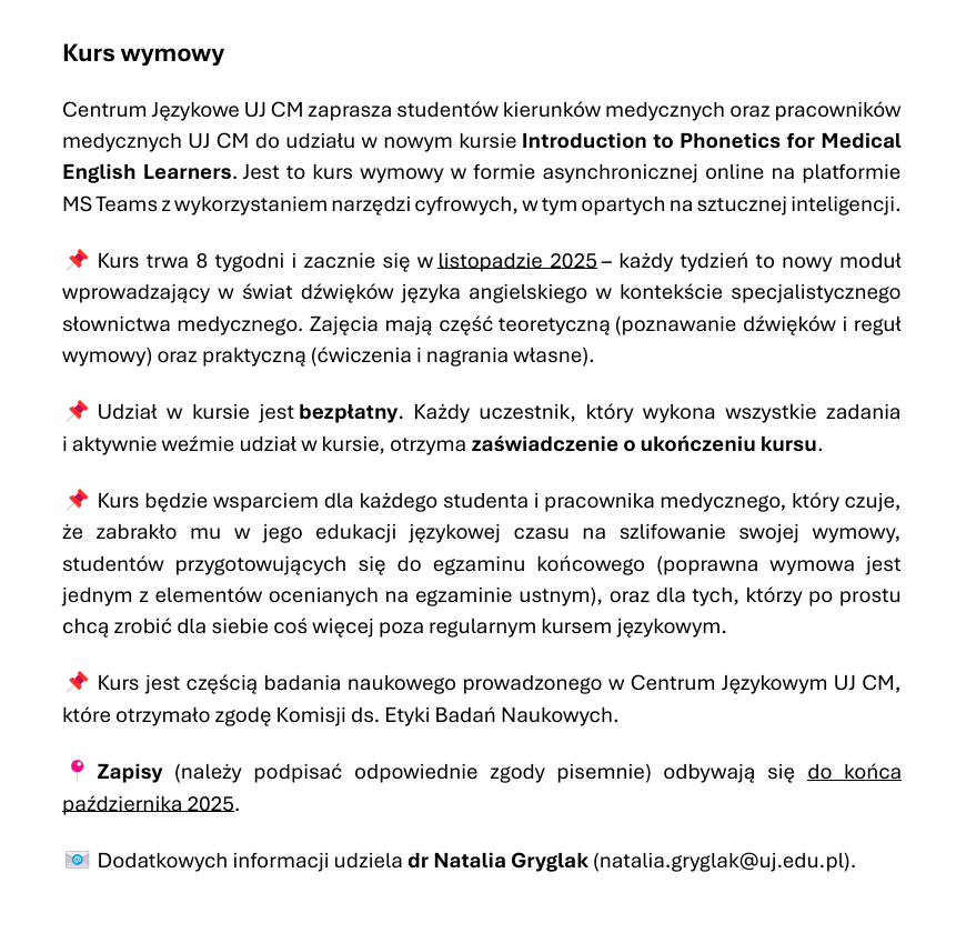 Lektoraty dla studentów Wydziału Lekarskiego i Wydziału Farmaceutycznego rozpoczynających studia przed rokiem akademickim 2023/24